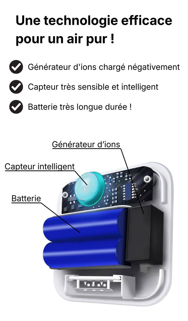 AirPurr libère des ions purifiants qui neutralisent les molécules responsables des mauvaises odeurs.